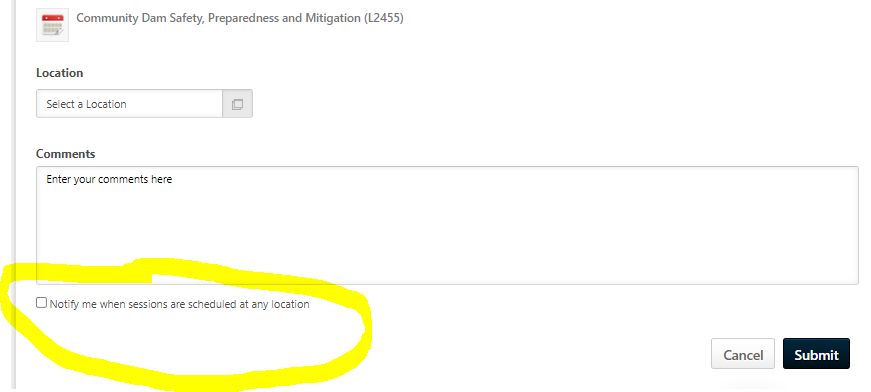Always select "Notify me of when sessions are available at any location" (Figure 2.) unless you can find a specific location from our large list. The list location is large and frequently changes, so you may miss the notification if the wrong location is chosen, that is why it is best to select all locations.